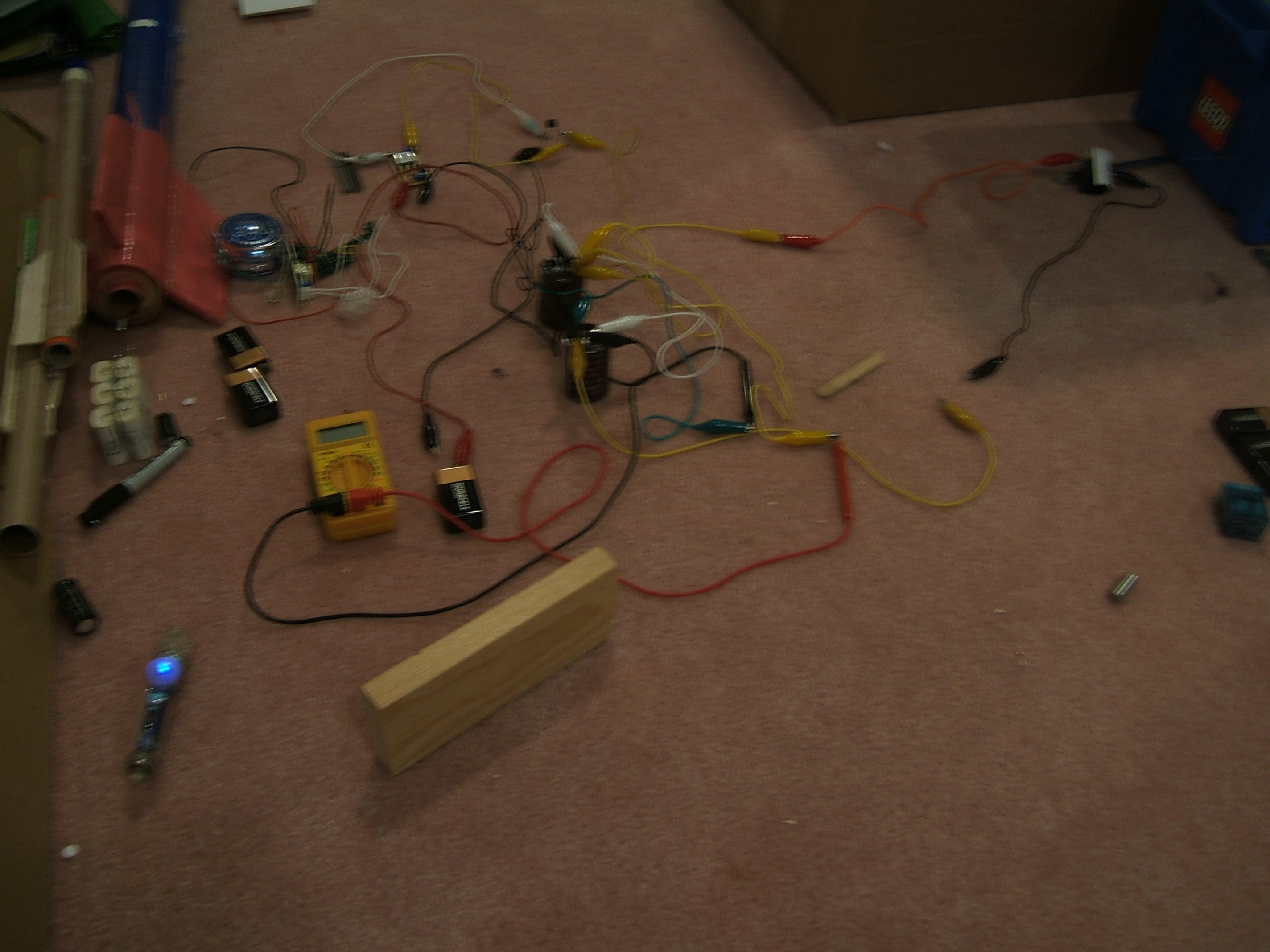 Needless to say, my parents were not very happy. Actually, the way I set everything out was very dangerous, especially if someone came and didn’t know what they were doing. Some of the hazards include (but are not limited to), the capacitors, each of which can be charged to a lethal level, the HV converter, which could cause fires and (obviously) shock people, and of course the whole fact that this thing could launch projectiles…